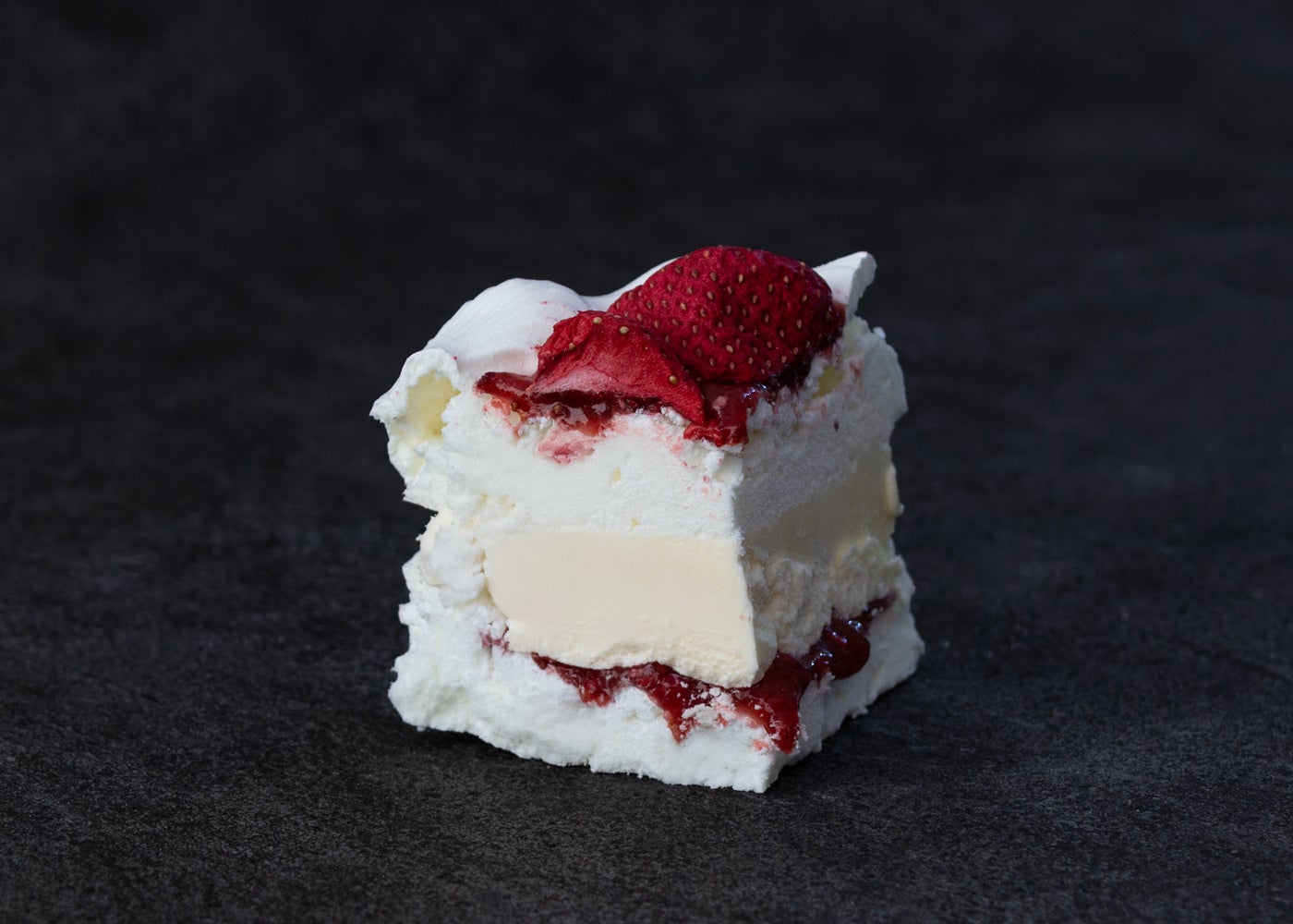 一口頬張ると、まず感じられるのはサクッとしたメレンゲの軽やかな歯ざわり。その後、ホイップした塩バターがじんわりと口の中で溶け出し、クリーミーなコクとともに絶妙な塩味が甘みを引き立てます。さらに、ストロベリーソースの酸味が全体を引き締め、フリーズドライいちごの濃縮されたフルーティーな風味が口いっぱいに広がります。この多層的な味わいは、一度食べたら忘れられない感動を呼び起こします。