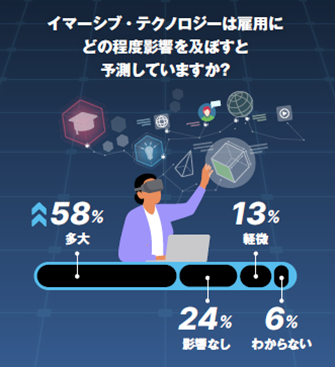 世界平均の58%(日本:31%)は、イマーシブ・テクノロジーが、従業員の雇用に「多大」に影響すると回答しています。「影響なし」が、世界平均:24%(日本:41%)、「軽微」は、世界平均:13%、(日本:9%)、「わからない」では、世界平均:6%(日本:18%)となりました。