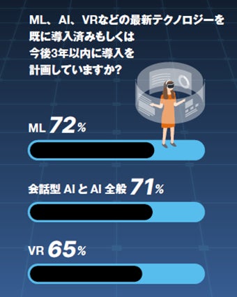 「機械学習(ML)※⁴を導入済みか3年以内に導入の計画」と回答したのは、世界平均:72%(日本:43%)です。「会話型AIとその他のAI全般の導入」については、世界平均:71%(日本:42%)と回答しました。VRは、世界平均が65%(日本:35%)の結果となり、世界の企業では、それほど遠くない将来にVRを使用しようとしています。