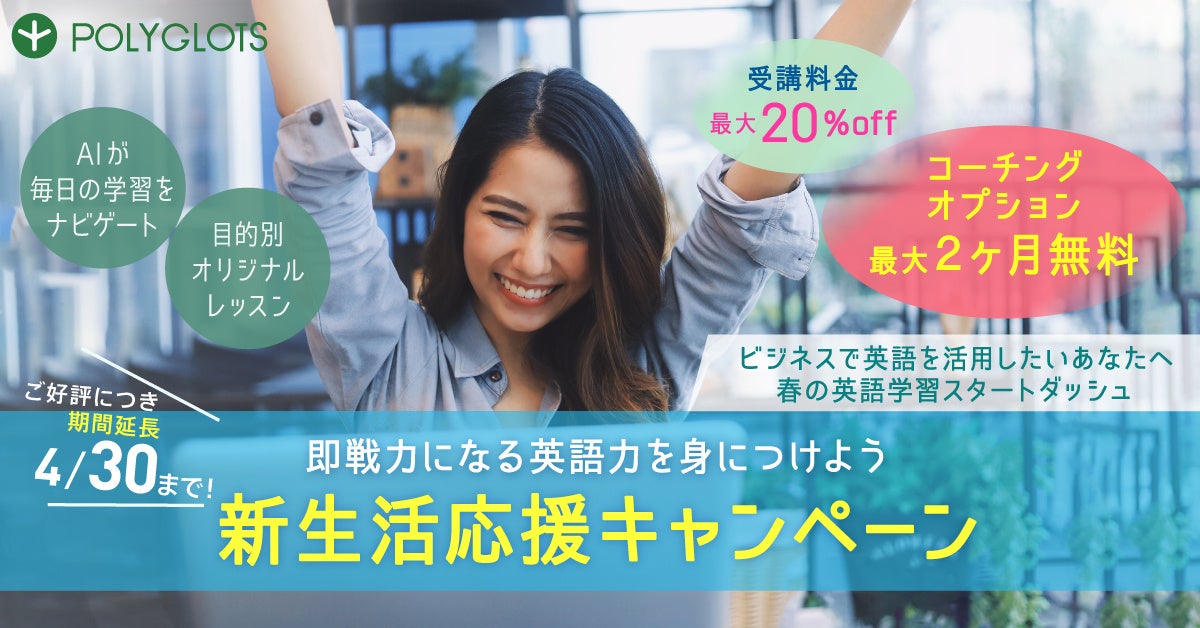 株式会社ポリグロッツ(本社:東京都新宿区、代表取締役:山口隼也)は、コーチングオプションを初月無料やパーソナルレシピ型英会話プランを最大20%OFFでご提供する「新生活応援キャンペーン」をご好評につき 2024年4月30日(火)まで延長いたします。さらに、追加特典としてコーチングオプションを2ヶ月無料とさせていただきます。このお得な機会に、トレーナーと一緒に英語学習を強化してください。