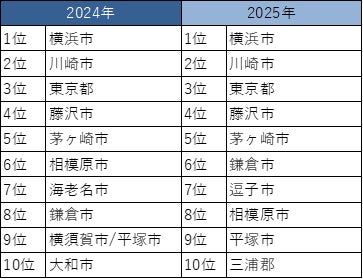 ■都市別ランキング上位5つは昨年と変化がなく、前回ランク外だった逗子市が7位にランクインした。