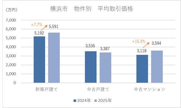■横浜市の平均取引価格は2024年と比較して新築戸建で約7.7%、中古マンションで約15.3%の増加と
