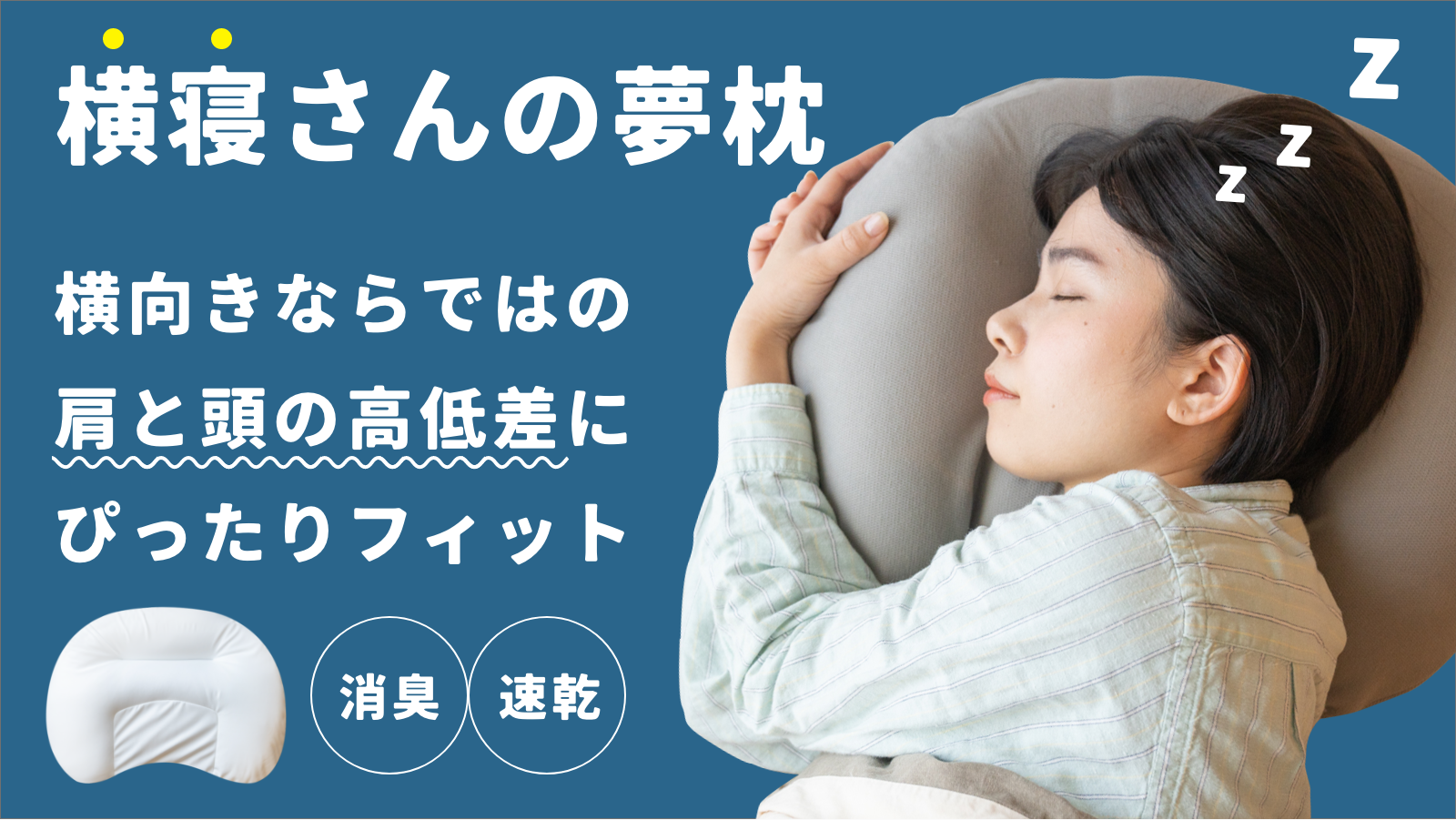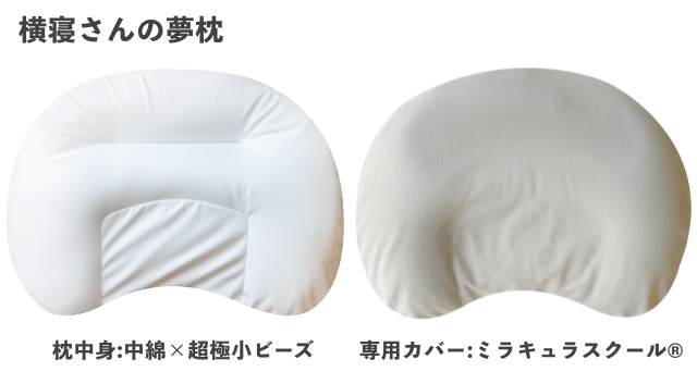 横向きで寝る方のために開発された、肩と頭の高低差にフィットする「横寝さんの夢枕」