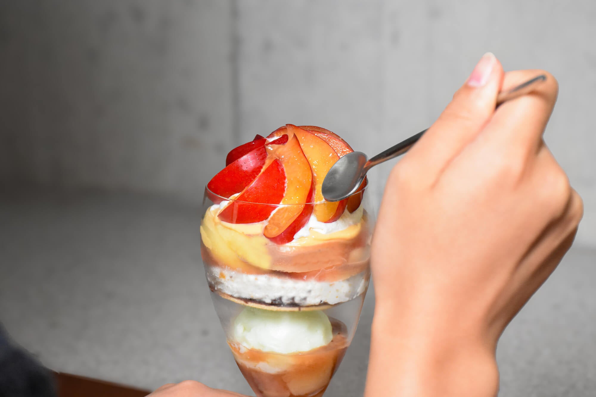 ジューシーな桃とチョコレートの相性を楽しみながら、移り変わる味わいを堪能する桃パフェ