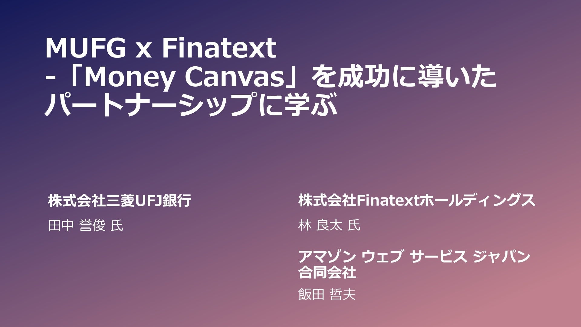 2021年12月、MUFGは資産運用プラットフォーム「Money Canvas」をリリースしました。このサービスは、MUFGグループだけでなく、パートナー企業の商品やサービスも取り扱う画期的なものです。また、その開発にはFintech企業であるFinatextの「デジタル金融の統合基盤」が活用されています。本パネルセッションでは、MUFGの「Money Canvas」開発の狙い、その実現においてFinatextが果たした役割、またクラウド技術の活用のポイントを解き明かしていきます。