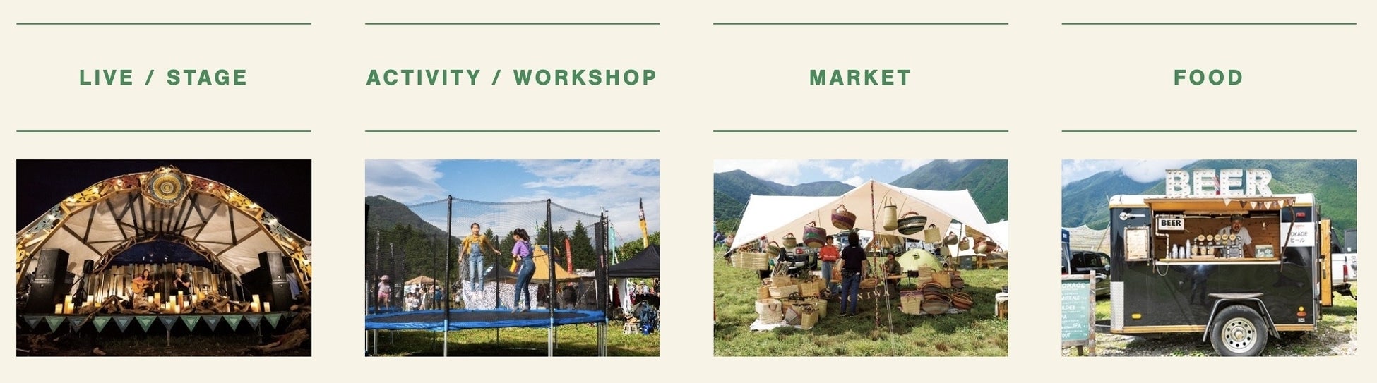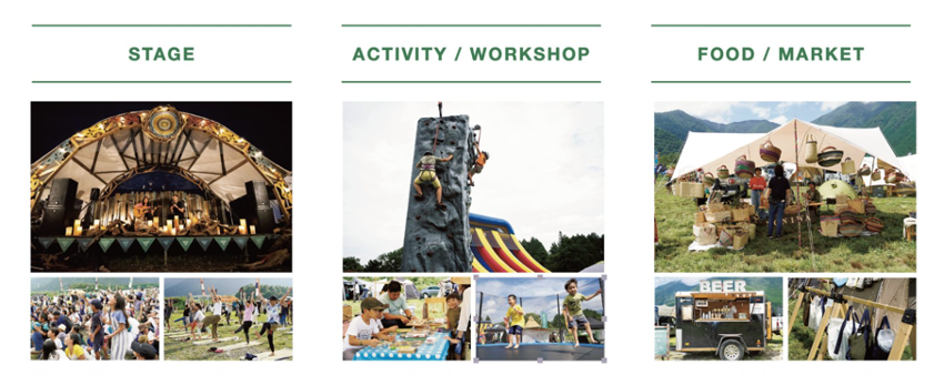会場を盛り上げる音楽ライブをはじめとするステージコンテンツや、アウトドアがより楽しくなるお買い物ブース、キャンプで試したくなる料理対決など内容は盛りだくさん。アウトドアがもっと好きになるクラフト系ワークショップやキッチンカーも多数出店する予定です。