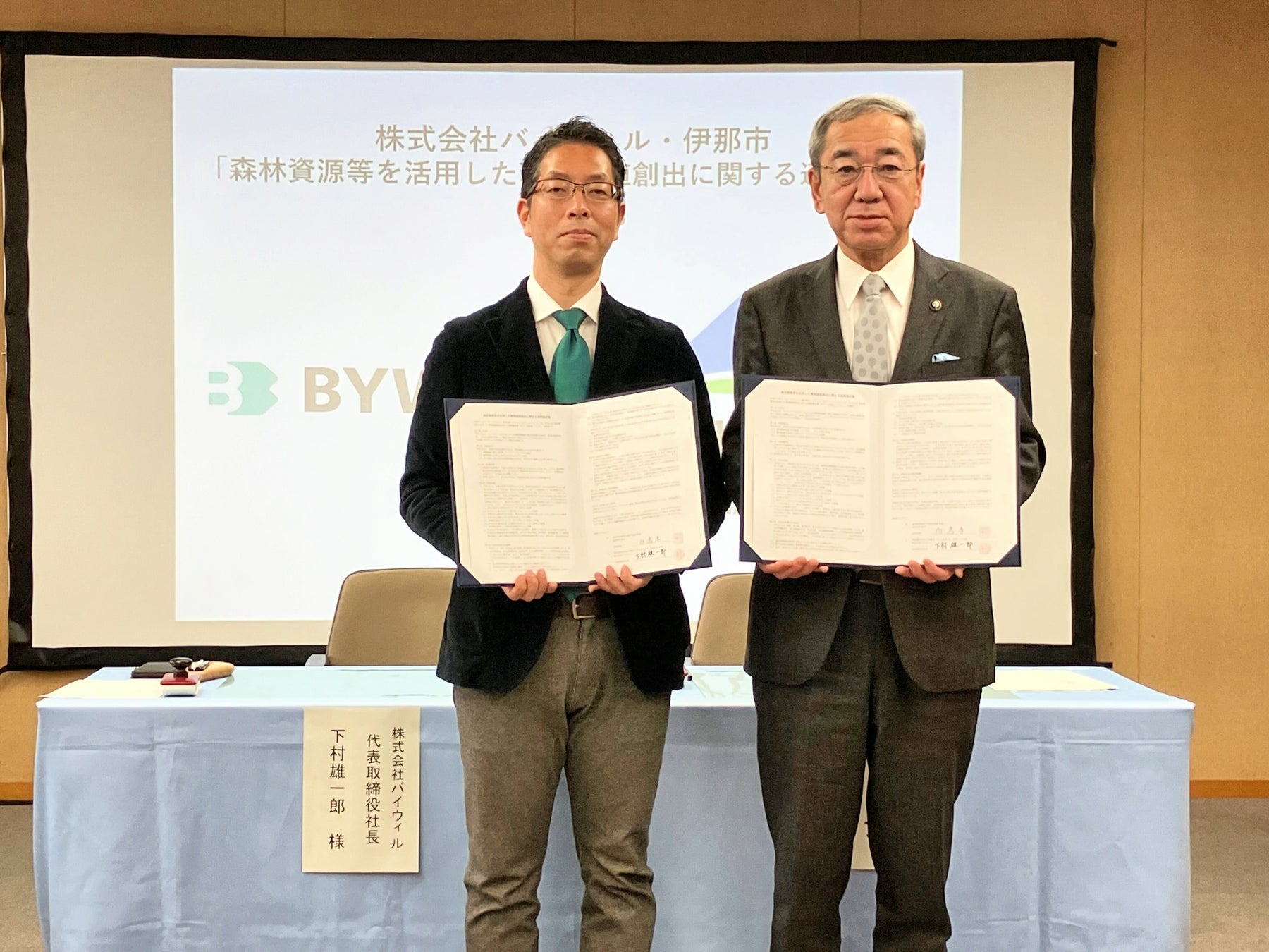 日本全国47都道府県のカーボンニュートラル実現を目指す株式会社バイウィル(本社:東京都中央区、代表取締役社長:下村 雄一郎、以下「バイウィル」)は、長野県伊那市(伊那市長:白鳥 孝、以下「伊那市」)と森林資源等を活用した環境価値創出に関する連携協定を締結しました。