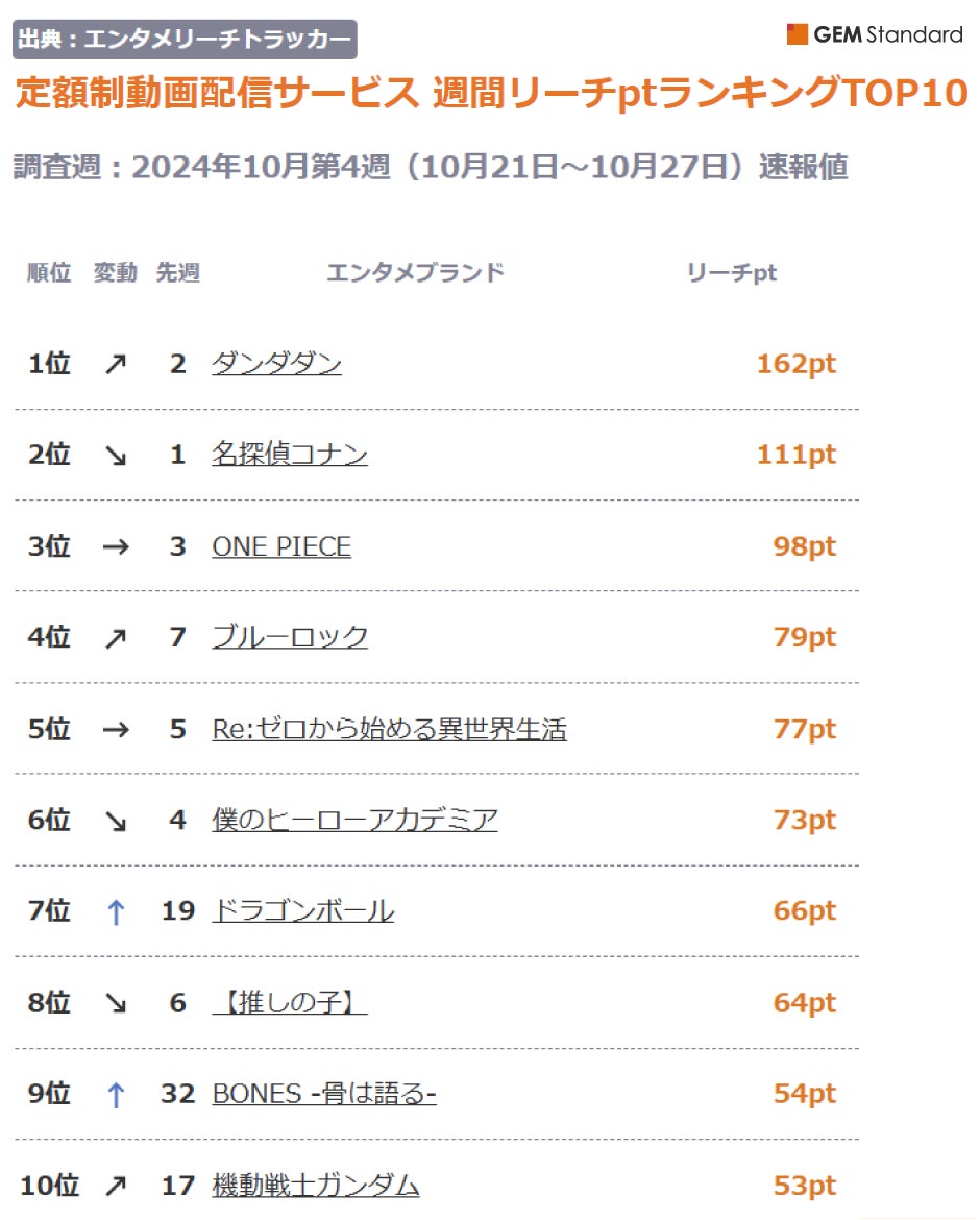 『ダンダダン』首位獲得、『ドラゴンボール』『BONES』『ガンダム』上昇~定額制動画配信サービス 週間リーチptランキング(2024年10月第4週)【GEM Partners】