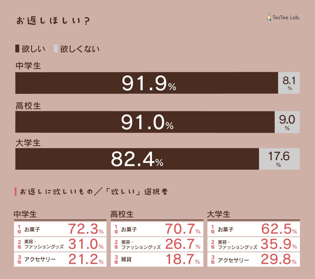 さらに、「お返しが欲しい」と回答した人にお返しに欲しい物を聞いたところ、いずれの年代においても、第1位は「お菓子」と回答した人が多く、第2位は「美容・ファッショングッズ」と続きました。