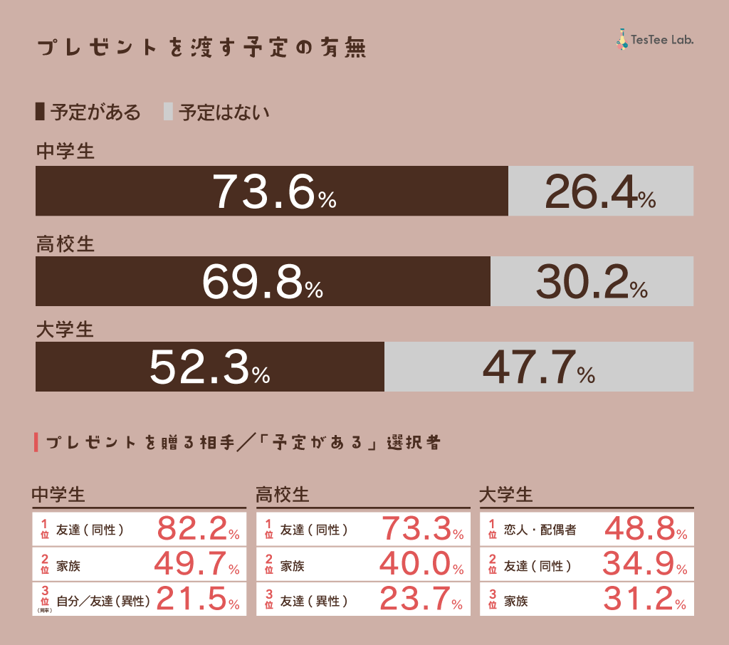 学生の女性1,410名を対象に、バレンタインにプレゼントを渡す予定があるかどうかを聞いたところ、「予定がある」と回答した人は中学生で73.6%、高校生で69.8%、大学生で52.3%という結果になり、2024年の調査でも中学生の参加意欲が最も高いことがわかりました。