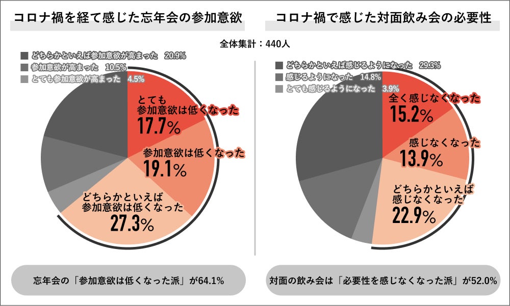回答者全体の440人にコロナ禍を経て感じた忘年会の参加意欲を聞くと「参加意欲は低くなった派」が64.1%で過半数を占め、内訳は「とても参加意欲は低くなった」17.7%、「参加意欲は低くなった」19.1%、「どちらかといえば参加意欲は低くなった」27.3%でした。同また、コロナ禍で感じた対面飲み会の必要性については「感じなくなった派」が52.0%で過半数を占め、内訳は「全く感じなくなった」15.2%、「感じなくなった」13.9%、「どちらかといえば感じなくなった」22.9%でした。