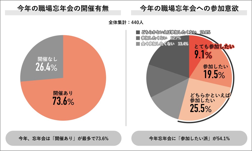 回答者全体の440人に聞いた今年の職場忘年会の実施有無では「開催あり」が73.6%、「なし」が26.4%で、前年の実施率を上回る結果となりました。今年の職場忘年会への参加意欲を聞くと「参加したい派」は54.1%で過半数を占め、内訳は「とても参加したい」9.1%、「参加したい」19.5%、「どちらかといえば参加したい」25.5%でした。