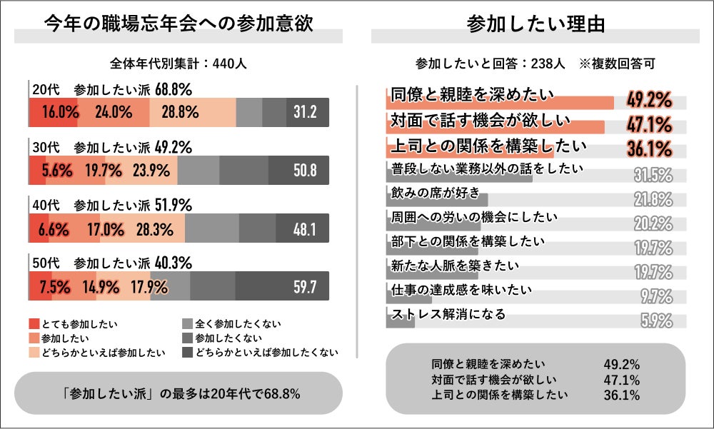 ・全体の54.1%が今年職場忘年会に「参加したい」 20代が2年連続最多 参加理由は「同僚との親睦」が1位
