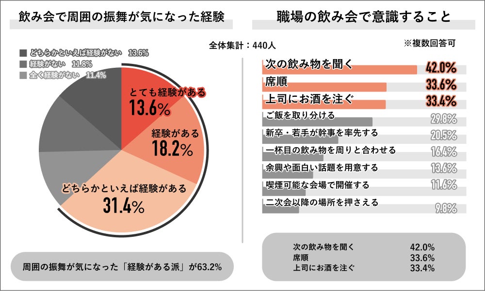 回答者全体の440人に飲み会で周囲の振る舞いが気になった経験の有無を聞くと「経験がある派」が63.2%と過半数を占め、内訳は「とても経験がある」13.6%、「経験がある」18.2%、「どちらかといえば経験がある」31.4%でした。同回答者に職場の飲み会で意識することを聞くと「次の飲み物を聞く」が42.0%で最多となり、次いで「席順」が33.6%、「上司にお酒を注ぐ」が33.4%となりました。