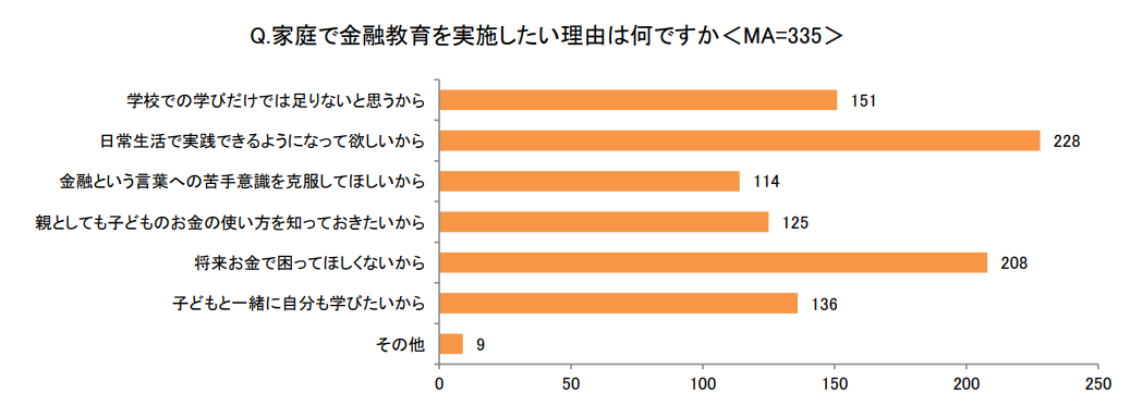 「家庭で金融教育を実施したいと思いますか<SA>」と聞いたところ、9割以上の親が「はい」(306)と回答し、「家庭で金融教育を実施したい理由は何ですか<MA>」では、1位「日常生活で実践できるようになって欲しいから」(228)、2位「将来お金で困ってほしくないから」(208)が上位となり、6割以上なった。また、「学校での学びだけでは足りないと思うから」(151)に加えて、「子どもと一緒に自分も学びたいから」(136)、「親としても子どものお金の使い方を知っておきたいから」(125)にも4割前後の回答が集まり、親自身が金融知識にあまり自信がないからこそ、子どもには今のうちから学ぶ機会が必要だと考えていることが伺えます。