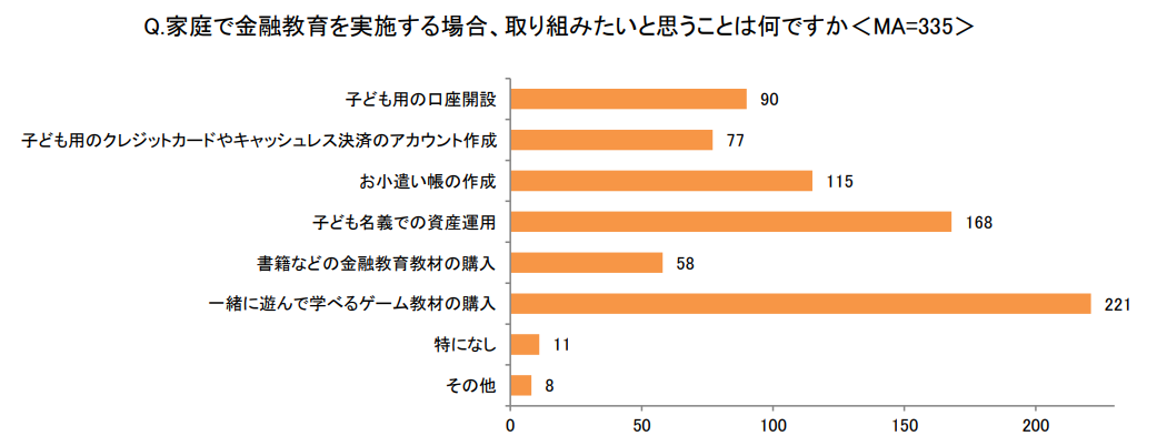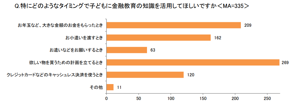 「家庭で金融教育を実施する場合、取り組みたいと思うことは何ですか<MA>」の問について、1位「一緒に遊んで学べるゲーム教材の購入」(221)、2位「子ども名義での資産運用」(168)、3位「お小遣い帳の作成」(115)の順となりました。また「特にどのようなタイミングで子どもに金融教育の知識を活用してほしいですか<MA>」では、「欲しい物を買うための計画を立てるとき」(269)、「お年玉など、大きな金額のお金をもらったとき」(209)、「お小遣いを渡すとき」(162)という結果となりました。このことから、子どもと一緒に楽しく学び、クリスマスやお正月などのイベントを通じて金融知識を活用してほしいと考える親や、子どものために将来を見据えて資産運用をしたいと考えている親が多いことがわかります。
