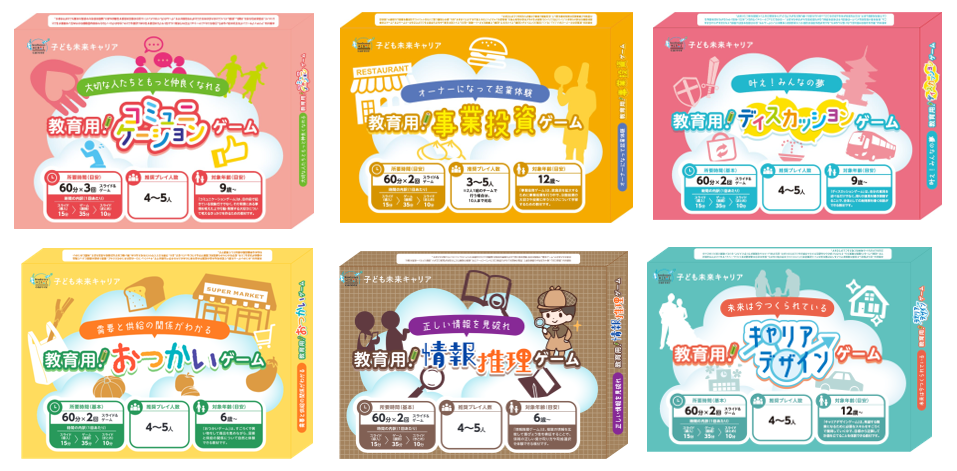 『子ども未来キャリア(新教材)』は、『子ども未来キャリア』をより授業で扱いやすいようにブラッシュアップしパッケージ化した新教材です。従来の『子ども未来キャリア』の特性を引き継ぎ、ボードゲームを通じた疑似体験と、スライド教材を活用した学習を組み合わせた「遊び×学び」を融合した内容で、主体的に楽しく学ぶことができます。