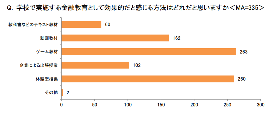 学校で実施する金融教育として効果的だと感じる方法は「ゲーム教材」「体験型授業」と回答