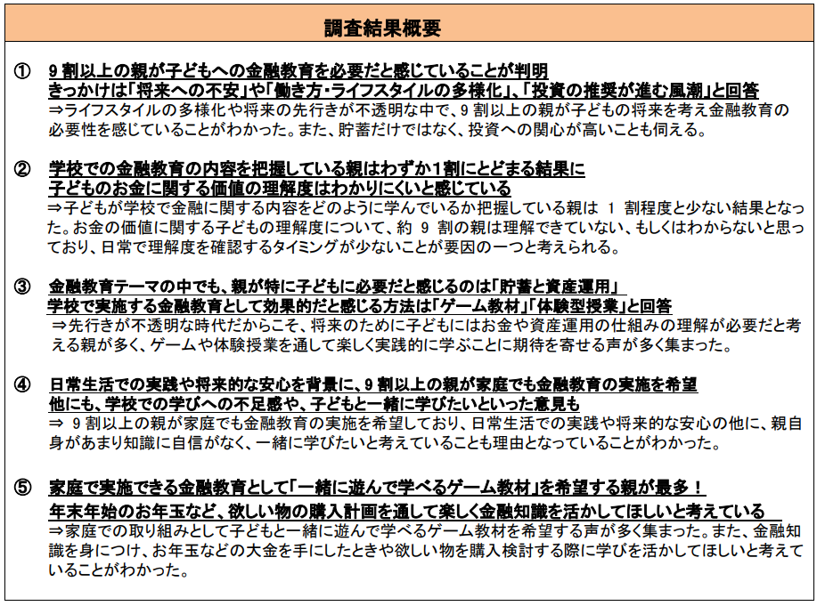 調査の結果、働き方やライフスタイルの変化など先行きが不透明な時代を生き抜くために、子どもに金融教育が必要だと多くの親が感じていることが伺えます。一方で、学校での学習内容や子どものお金の価値の理解度が感じられにくいことから、家庭でゲーム教材などを通して楽しく実践的に知識をつけてほしいと考えていることがわかりました。