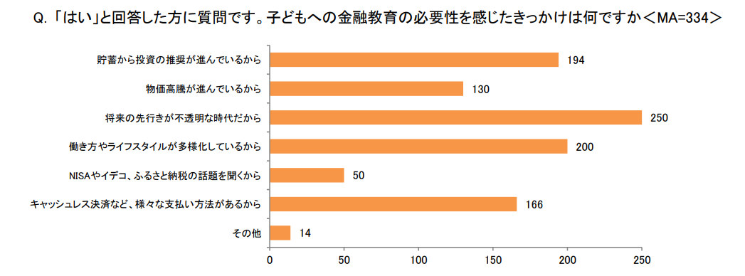 「子どもへの金融教育は必要だと感じますか<SA>」の問について、9割以上が「はい」(334)と回答しました。さらに、「子どもへの金融教育の必要性を感じたきっかけは何ですか<MA>」と聞いたところ、「将来の先行きが不透明な時代だから」(250)が7割以上となり、最も多くなりました。これに続いて「働き方やライフスタイルが多様化しているから」(200)、「貯蓄から投資の推奨が進んでいるから」(194)、「キャッシュレス決済など、様々な支払い方法があるから」(166)の順にそれぞれ半数以上の回答がありました。この結果から、先行きの不透明な時代において変化に順応するための知識や行動の必要性を感じていることが伺えます。
