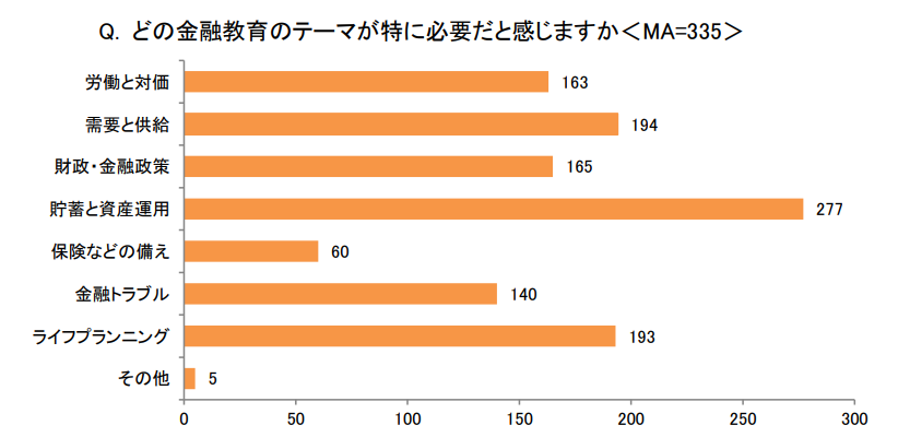 「どの金融教育のテーマが特に必要だと感じますか<MA>」では、「貯蓄と資産運用」(277)が最も多く、次いで「需要と供給」(194)、「ライフプランニング」(193)が、それぞれ約6割の回答を集めました。また、「学校で実施する金融教育として効果的だと感じる方法はどれだと思いますか<MA>」の質問では、「ゲーム教材」(263)、「体験型授業」(260)が7割以上となり、実践形式で楽しく知識を身につけてほしいと感じる親が多いことがわかりました。