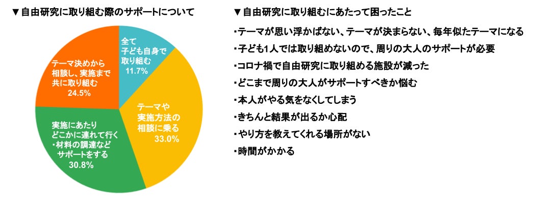 夏休みの自由研究について、「全て子ども自身で取り組む」と回答した家庭は11.7%と約1割程度にとどまり、大人がサポートしたり一緒に取り組むという家庭が約9割という結果となりました。