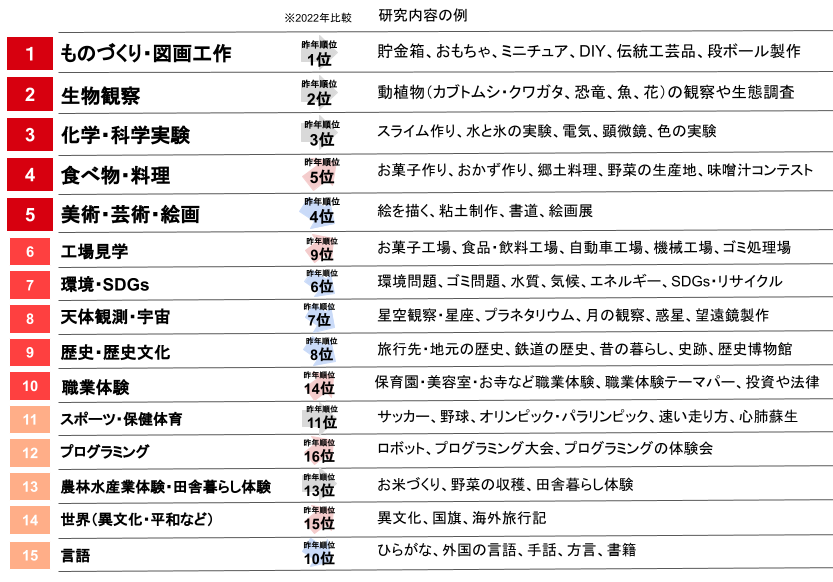 高学年になると、低学年では圏外だった「世界(異文化・世界平和)」が順位を大きく上げたほか、全体順位でベスト15圏外の「ファッション」が第15位にランクインするなど、自由研究のテーマの幅が広がることがわかります。