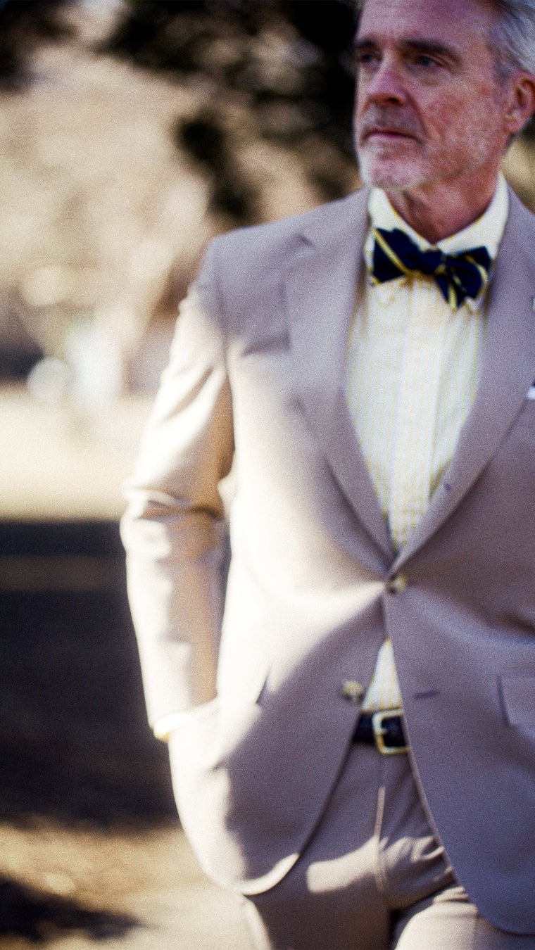 ざっくりとしたウール×コットン×リネンの三者混の素材は、世界三大毛織物産地である尾州で糸から企画生産し、”Made in USA” の服作りを牽引する縫製工場のひとつでもあるニューヨークのFerrara Manufacturing(フェラーラ・マニュファクチャリング) で縫製。ブルックス ブラザーズを代表するウエストの絞りのないボックス型の段返り3釦センターベントで仕上げました。リラックスしたフィット感、ナチュラルなショルダー、深いアームホールが特徴のTraditional(トラディショナル)モデルです。