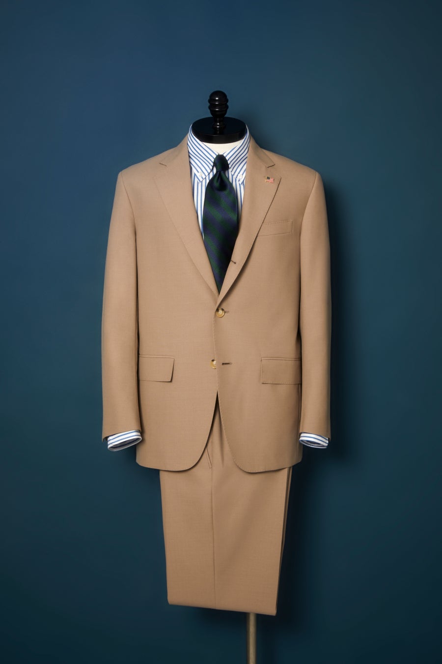 生地は、コネチカット州に所在する米国で唯一の梳毛メーカーであるAmerican Woolen Company(アメリカン ウーレン カンパニー)が米国海軍向けに開発したウールとポリエステルを緻密に織り上げた堅牢なポプリン生地を使用。ニューヨーク州のハイグレードテーラリングファクトリーであるRochester Tailored Clothing(ロチェスター テーラード クロージング:旧ヒッキー・フリーマン)で縫製。アメリカントラッドのアイコンであるポプリンスーツを、No.1サックモデルで別注しました。3釦段返りトラディショナルフィット。センターベント仕様