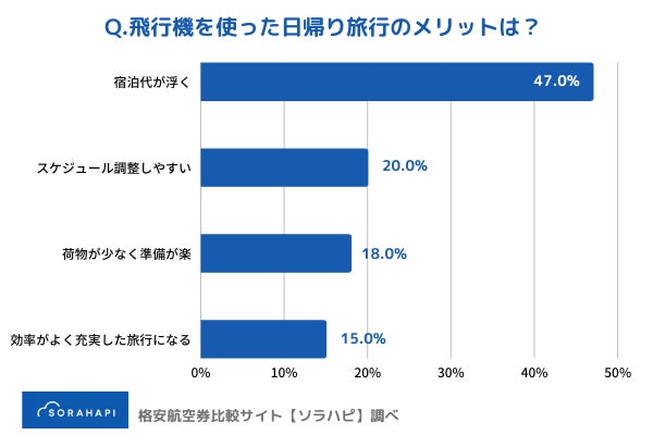 飛行機日帰り旅行のメリットとしてもっとも多く挙がったのが「宿泊代が浮く」(47.0%)という声です。