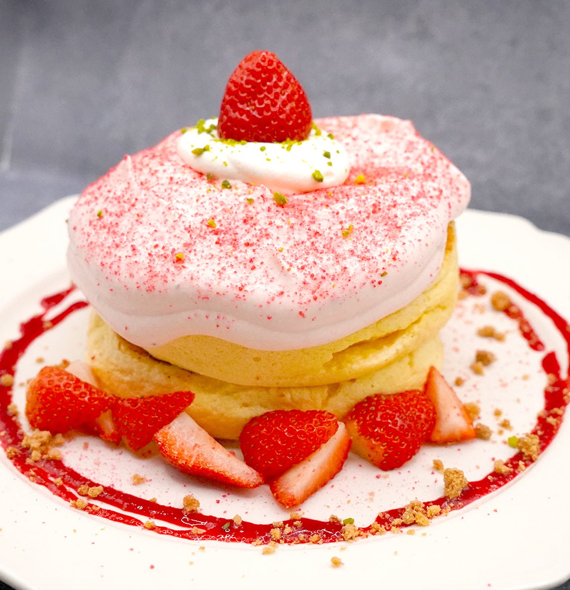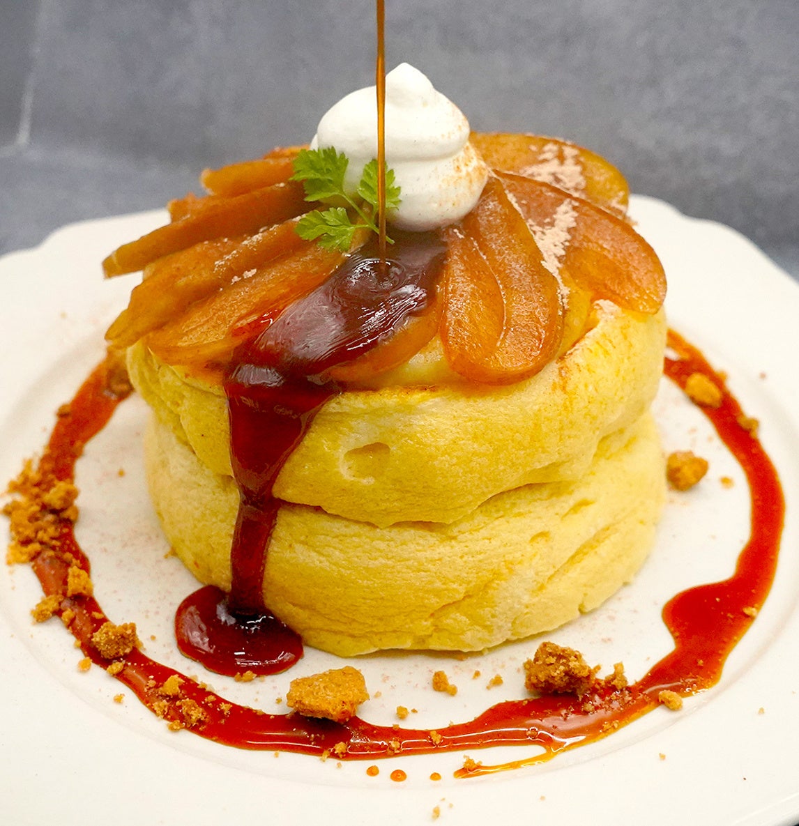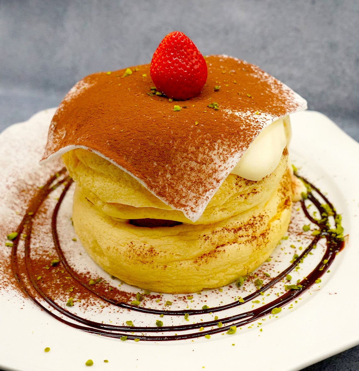 ぷるぷるに焼き上げたスフレパンケーキを2枚重ね、パンケーキを覆うとろとろのカスタードクリームをパリパリにブリュレした『ブリュレカスタードスフレパンケーキ』別添えのジェラートと一緒にお召し上がりください!スフレパンケーキの上にいちごの甘味と酸味を引き立てたイチゴクリーム、甘酸っぱいラズベリーパウダー、濃厚な生クリームとフレッシュないちごをトッピング!ベリー好きにはたまらない『Very ストロベリースフレパンケーキ』2段のスフレパンケーキにとろとろのティラミスクリーム、その上からココアパウダーをたっぷりとかけた『とろとろティラミスのスフレパンケーキ』スフレパンケーキにまろやかで甘みのあるお芋クリームをのせ、バターソテーしたスライスりんごに生クリームをトッピング!全体にシナモンパウダーを振りかけた『焼きリンゴとシナモン、発酵バターキャラメルのスフレパンケーキ』別添えの発酵バターキャラメルソースで味変もお楽しみいただけます。スフレパンケーキに自家製のティラミスクリームさらにお餅を乗せてフレッシュないちごをトッピング!いちご大福とティラミスがコラボレーションした『いちご大福ティラミスのスフレパンケーキ』などなど…お皿を揺らすとプルプルお口の中でふわふわとろけるスフレパンケーキ!是非お試しください♪