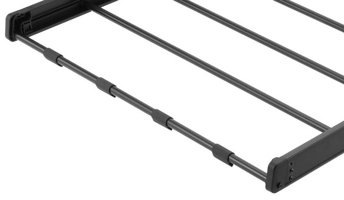 軽量で長尺物の積載にも対応するルーフラックですが、走行方向に対して横向きのパイプのラックは風切り音が出やすいため改良。付属のラバーウィングを最前列のパイプに装着し、風切り音の原因である気流を乱すことで風切り音を軽減することができます。