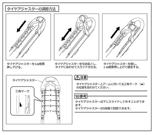 前モデルでは着脱式だったタイヤアジャスターを、スライド式に変更しました。タイヤサイズに合わせた調節が簡単になり、アジャスター紛失のリスクも軽減します。