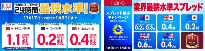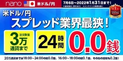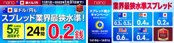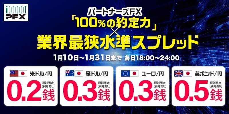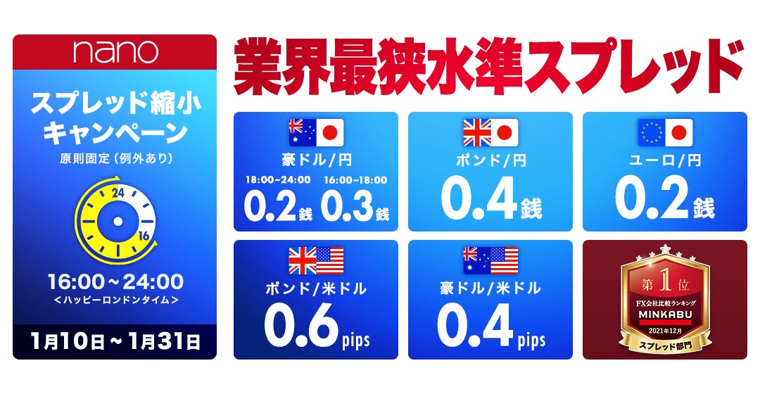 株式会社 マネーパートナーズ(代表取締役社長:福島秀治、本社:東京都港区、以下「当社」)では、2022年1月10日(月)~「パートナーズFX」および「パートナーズFX nano」で業界最狭水準のスプレッド縮小キャンペーンを実施しております。