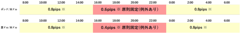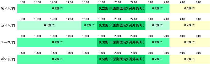 ※主要経済指標発表時等の急変時、国内外の休日や平日早朝など著しい流動性低下時はやむをえずスプレッドを拡大する場合がございます。