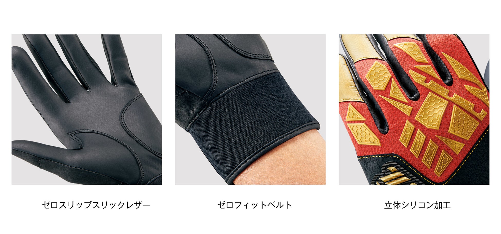 合成皮革にノンスリップ加工とフルフラット仕様を施した掌材=ゼロスリップスリックレザーが、バットグリップ部との密着性を高め、圧倒的なグリップ⼒を実現するとともにグラブ内での手指の滑りも抑制します。