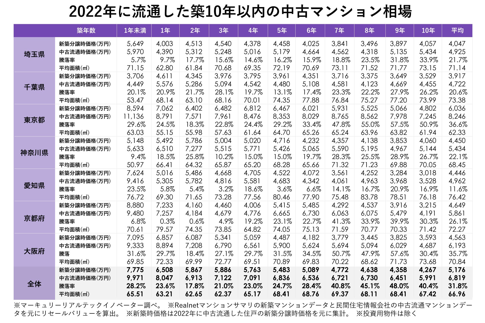 2022年に流通した築10年以内の中古マンションの相場を都府県別にみると、対象の7府県全てで中古平均価格が新築時価格を上回りました。