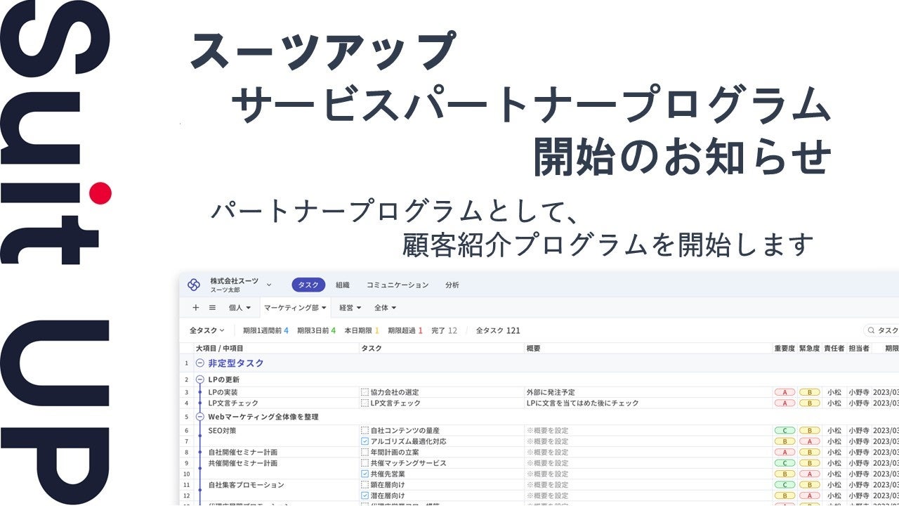 株式会社スーツ(所在地:東京都千代田区、代表取締役社長CEO:小松 裕介)は、チームでかんたん、毎日続けられるプロジェクト・タスク管理ツールの経営支援クラウド「Suit UP」(スーツアップ)において、パートナープログラムの一つとして、お客様にスーツアップをご紹介いただくサービスパートナープログラムを開始いたします。