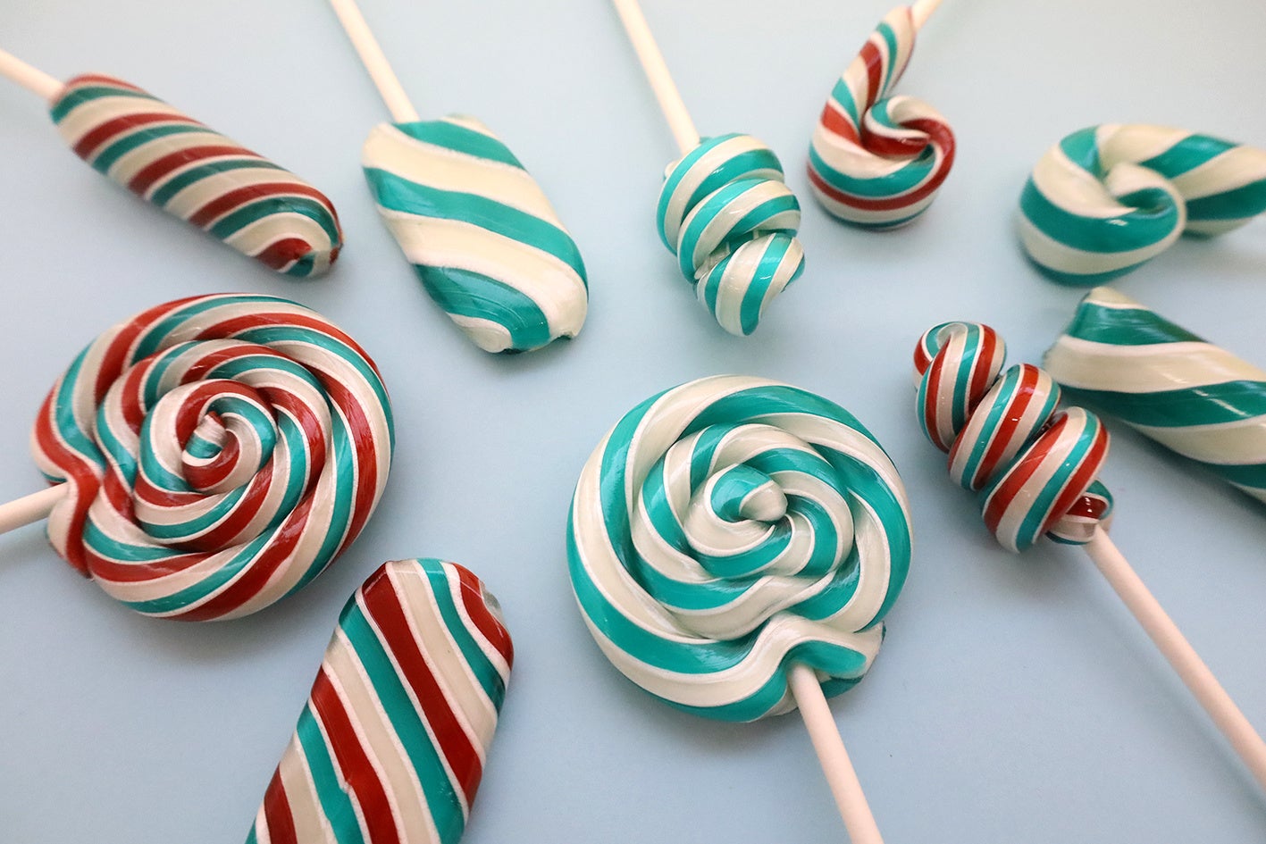 今年から新登場した、お試しサイズのチョコミントペティ。5cm前後のかわいいロリポップキャンディ(棒付きキャンディ)が、定番の円だけではなく、アイスキャンディやトルネードなど、いろいろな形から選べます。