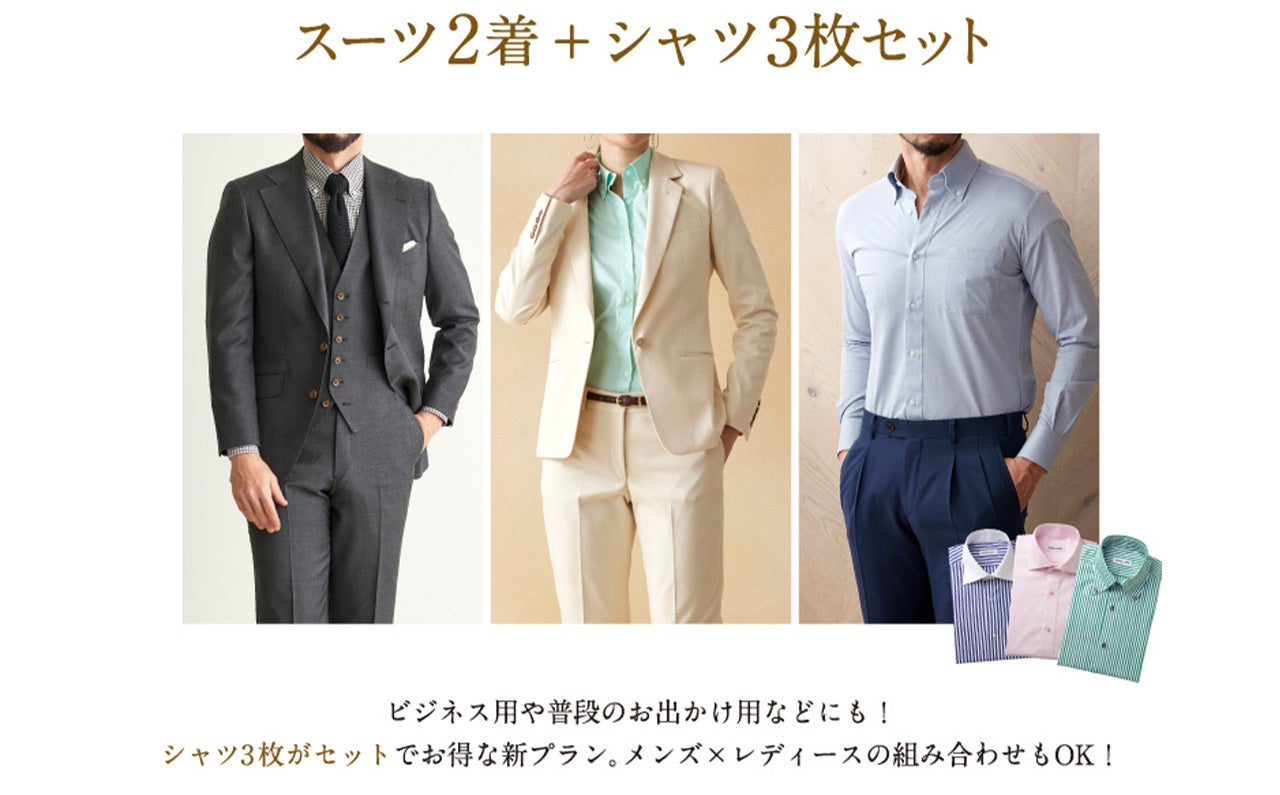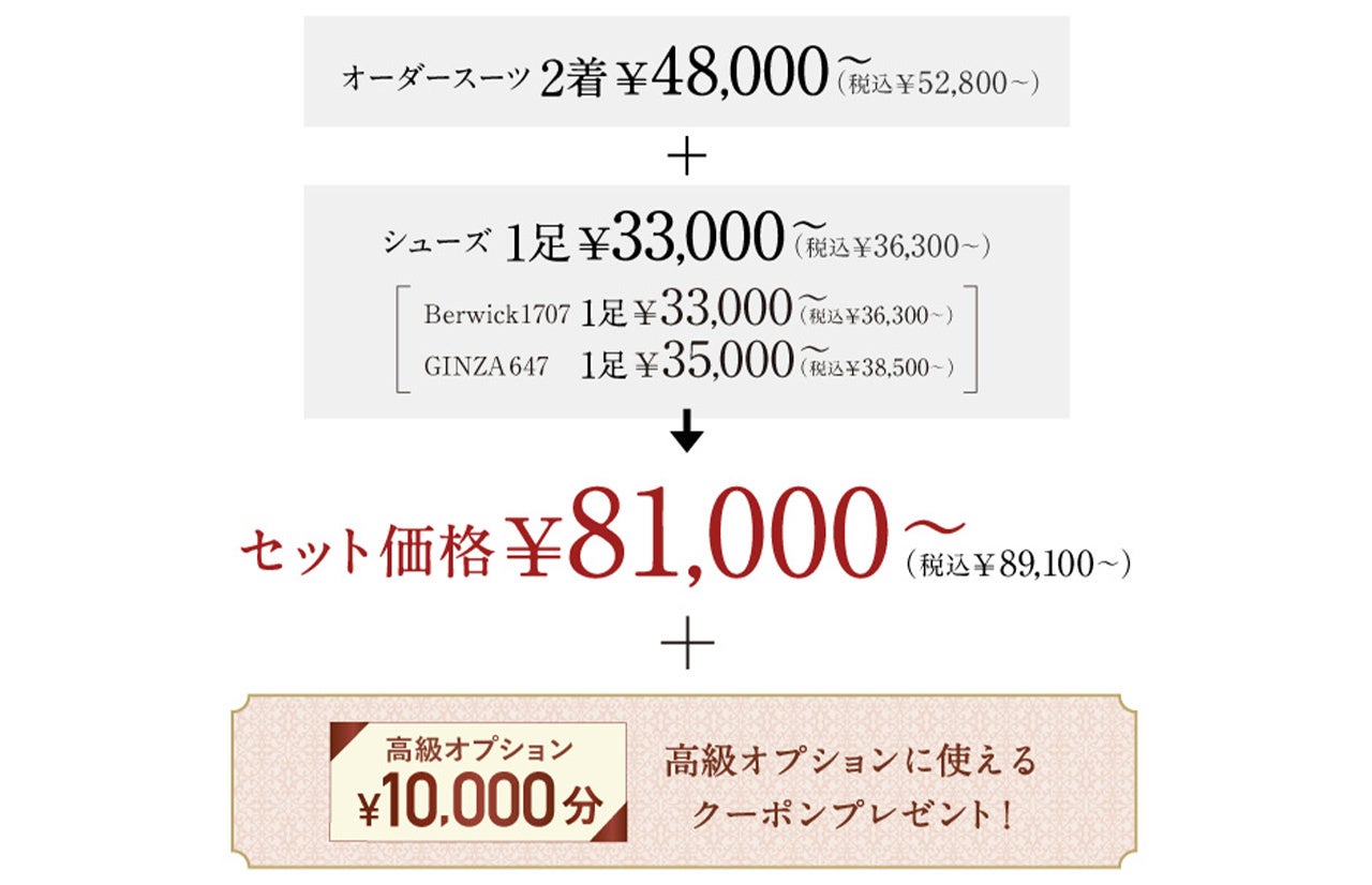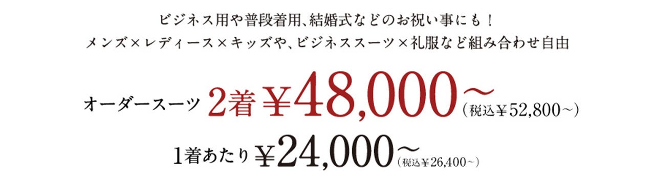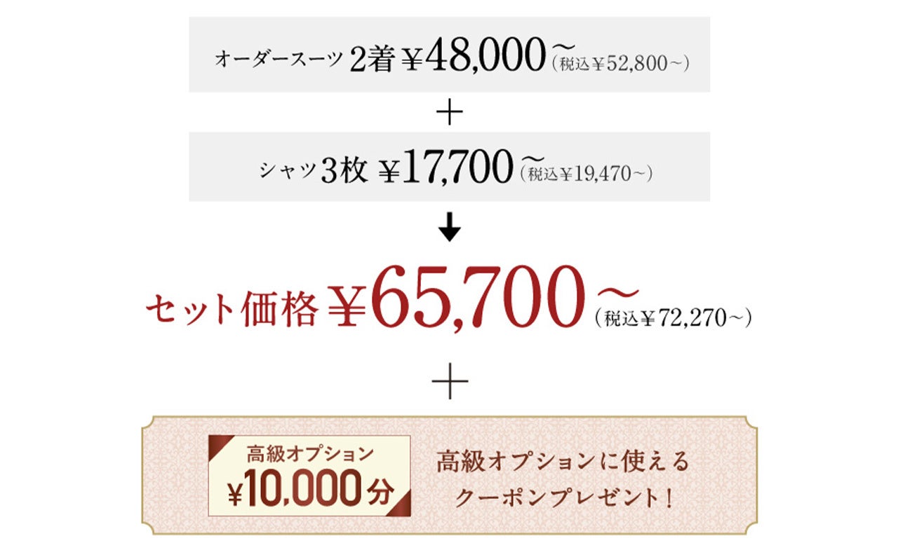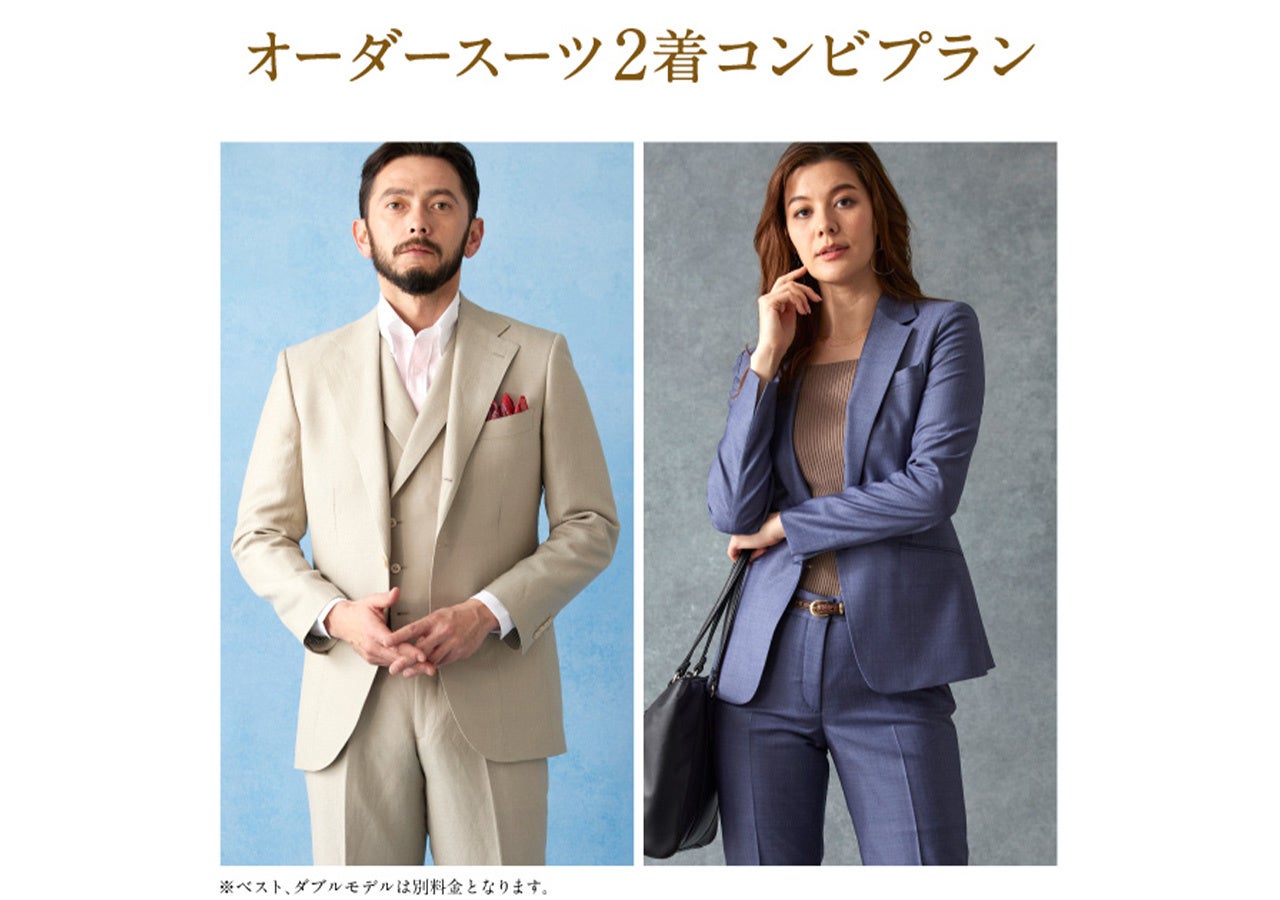 ※…コンビ価格とはオーダースーツ2着以上ご購入していただいた場合の1着あたりのお値段です。組み合わせは自由ですので、異なる価格帯のオーダースーツと組み合わせていただいても本価格が適用されます。