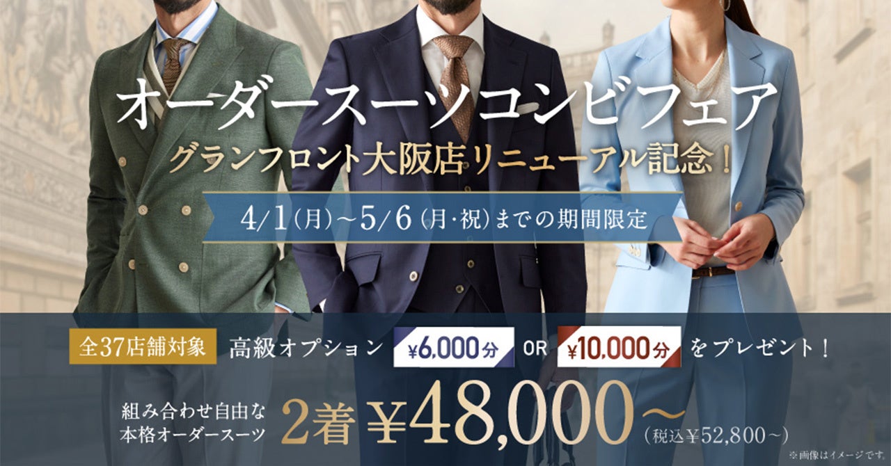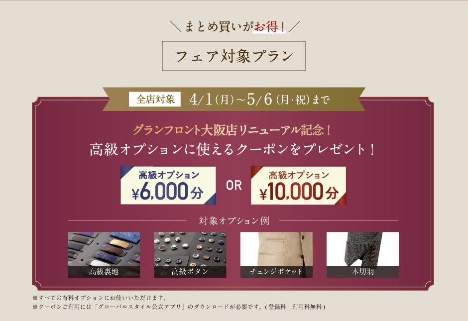 オーダースーツ専門店「グローバルスタイル」を運営するグローバルスタイル株式会社(東京証券取引所 スタンダード市場:7126、本社:大阪市中央区、代表取締役社長 田城弘志)は、グランフロント大阪店のリニューアルを記念して4月1日~5月6日までの期間中、対象プランご利用で高級オプションに使えるクーポン「6,000円分」or「10,000円分」をプレゼントをする「オーダースーツコンビフェア」を全37店舗で開催。