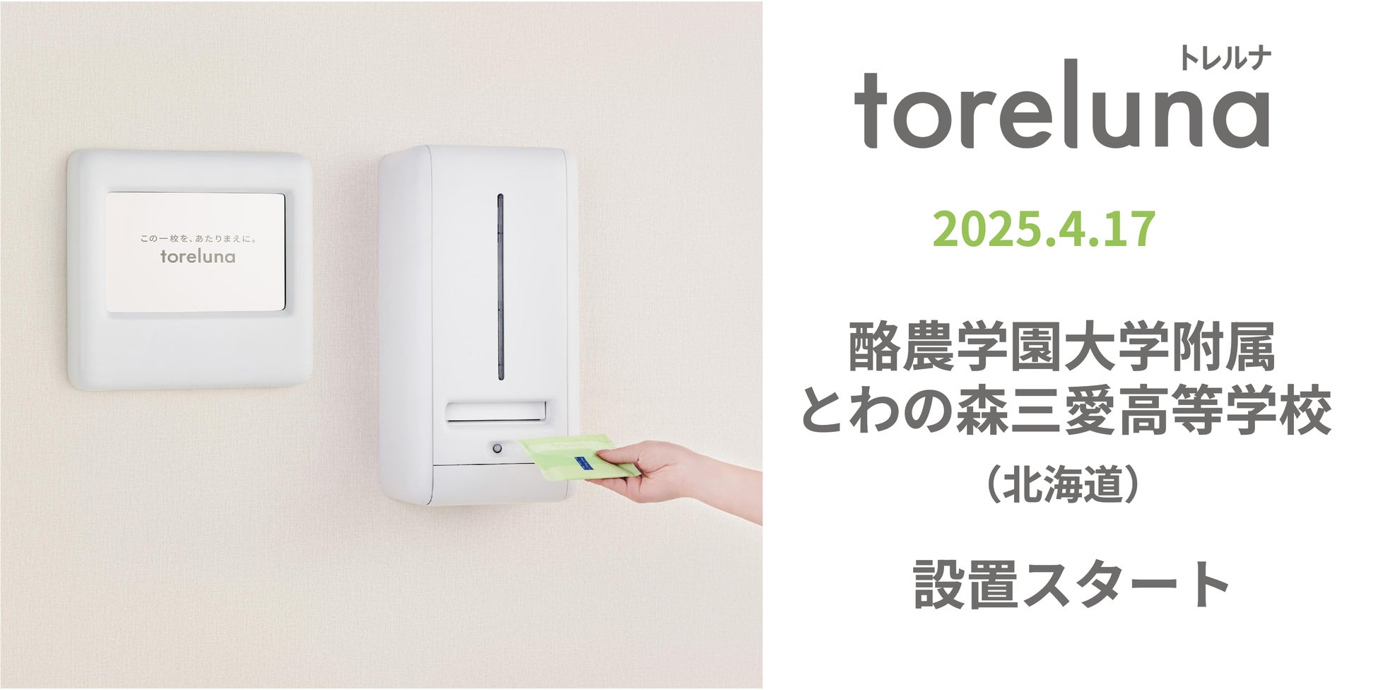株式会社ネクイノ(大阪市北区、代表:石井 健一)は、トイレの個室で生理用ナプキンを常備し無料で提供するサービス「toreluna(トレルナ)」(以下 トレルナ)を、4月17日より酪農学園大学附属とわの森三愛高等学校(北海道江別市)へ20台設置し、サービスの提供を開始いたします。なお、本サービスの高等学校への設置は、全国で初めての取り組みとなります。