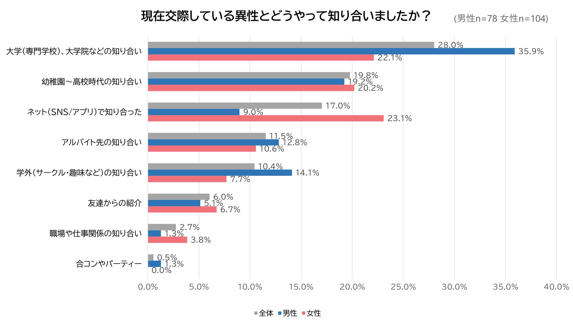 交際相手がいると回答した男女182名に、「相手とどうやって知り合ったか」について質問しました。全体のトップは昨年と同様、「大学(専門学校)、大学院などの知り合い」(28.0%)となり、昨年(24.4%)から3.6%増加しました。