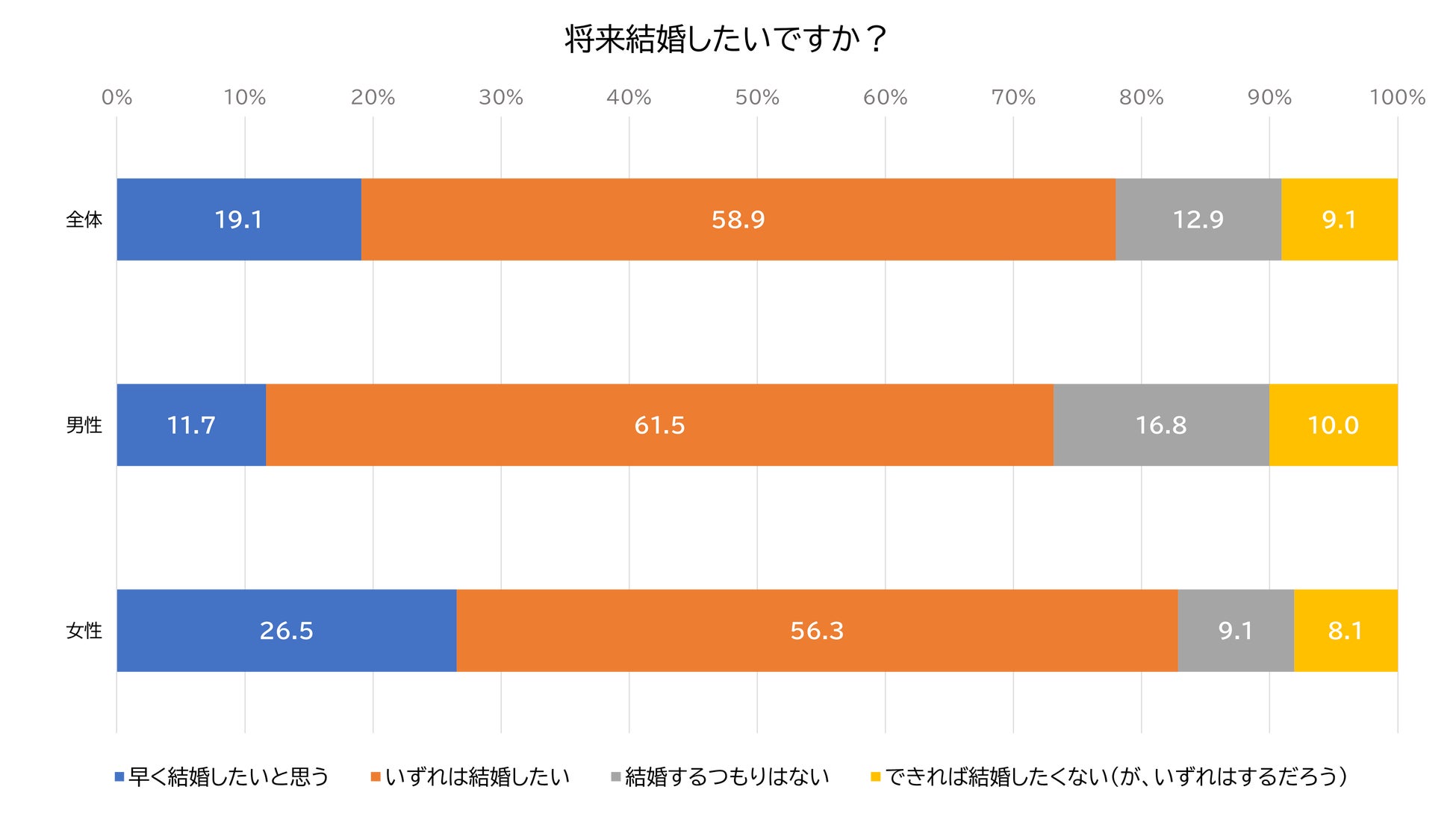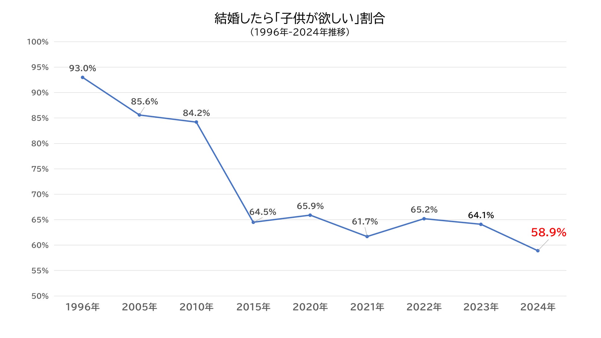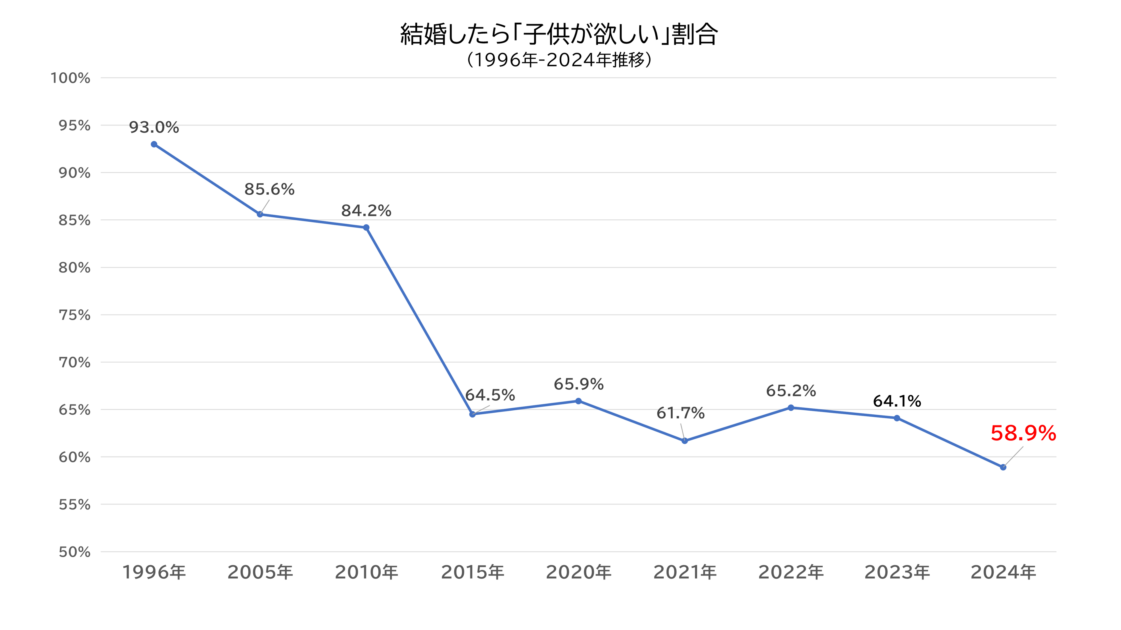 ・「結婚したら子供が欲しいですか?」に対し「はい」と回答した人は全体で58.9%と、昨年(64.1%)から5.4ポイント減少し、2017年以降初めて60%を下回り最低に。