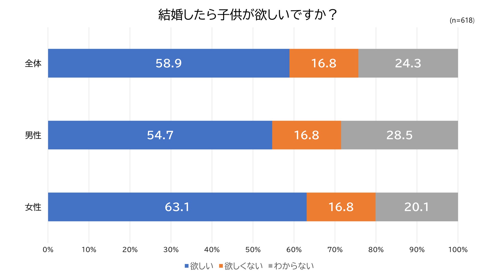 男女618名に、「あなたは結婚したら子供が欲しいですか?」と質問したところ、男女合わせて58.9%が「欲しい」、16.8%が「欲しくない」、24.3%が「わからない」と回答しました。