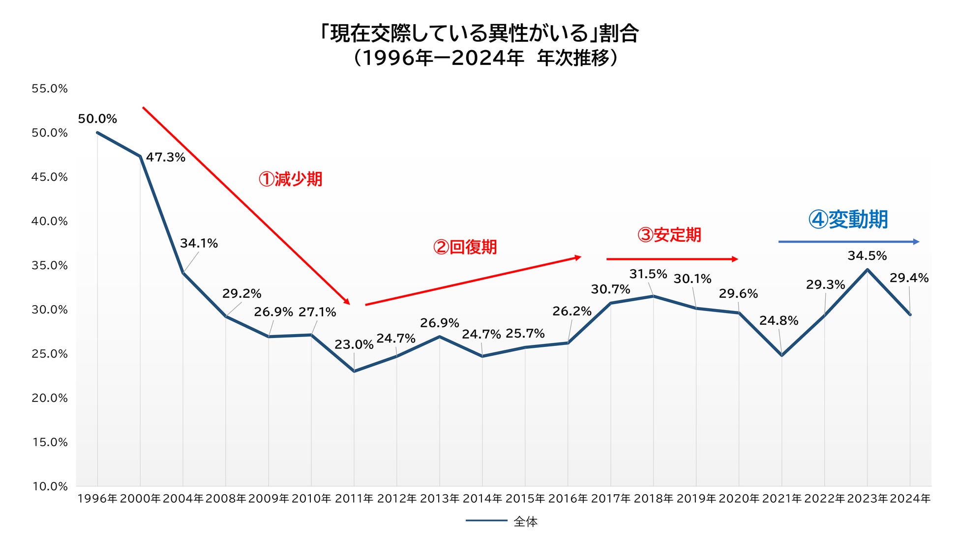 ・「現在交際している異性がいる」は全体で29.4%と、昨年(34.5%)から5.1ポイント減少。