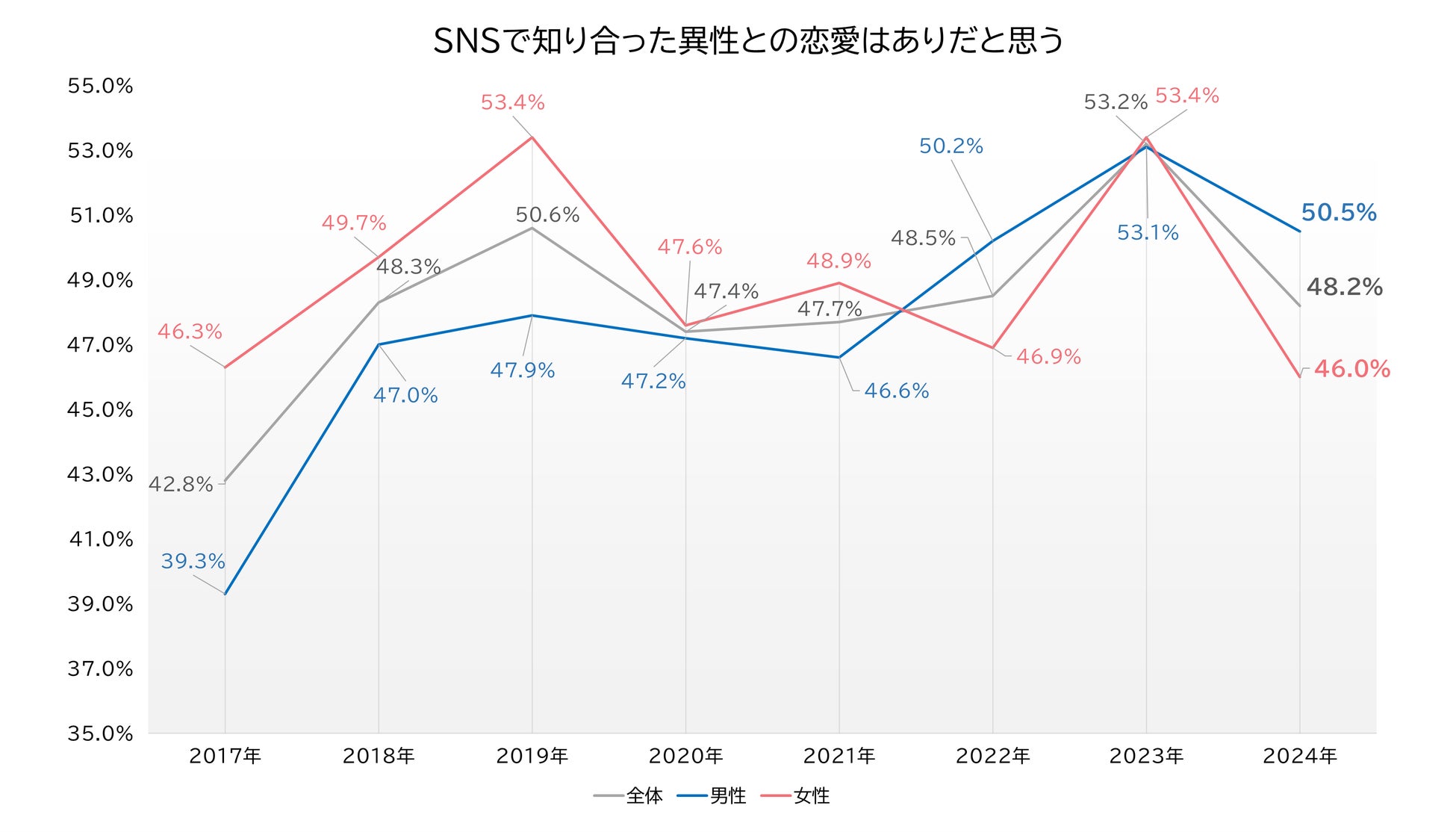 「ネットによる出会い」について、「SNSで知り合った異性との恋愛はあり」の回答は全体で48.2%と、昨年(53.2%)から5.0ポイント減少しました。