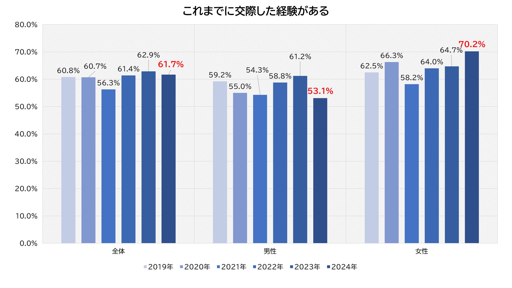 「これまでに交際した経験がありますか?」という質問に対して全体で61.7%が「交際経験あり」と回答し、過去7年間で最高の62.9%だった昨年から1.2ポイント減少となりました。男女別にみると、男性は昨年(61.2%)から8.1ポイント減少して53.1%と、2016年以降では2016年の47.0%に次ぐ低水準となったのに対して、女性は初めて70%を超え、男女差が17.1ポイントと大きく開きました。「ウィズコロナ」から「アフターコロナ」に転換する中で、男性は交際未経験の割合が増加した一方、女性の方が交際に向けてより積極的に行動したと考えられます。