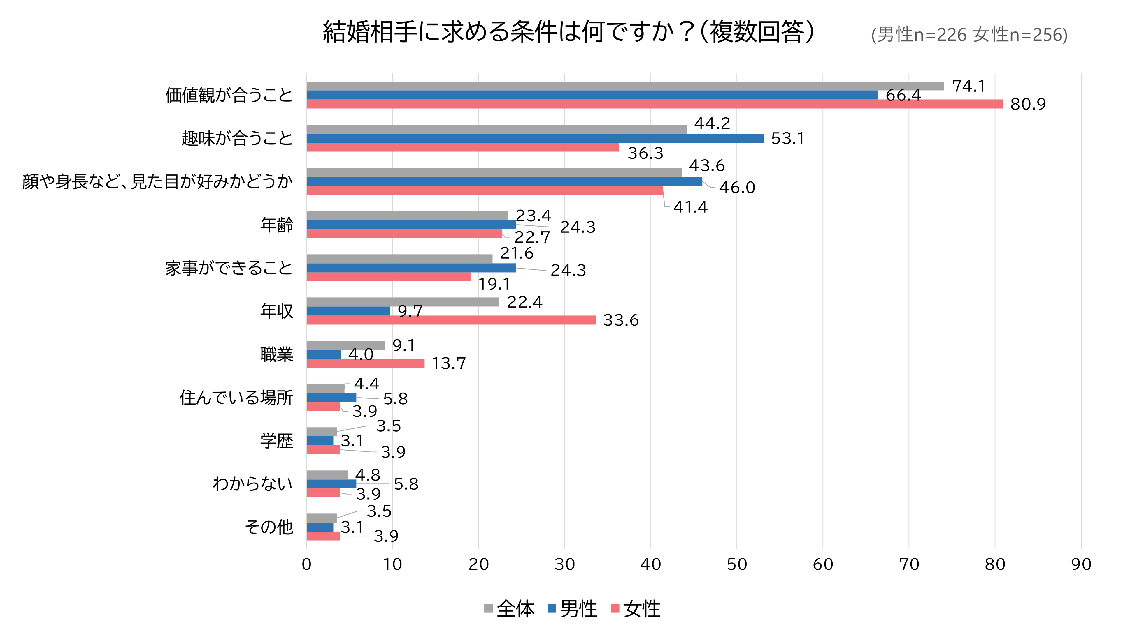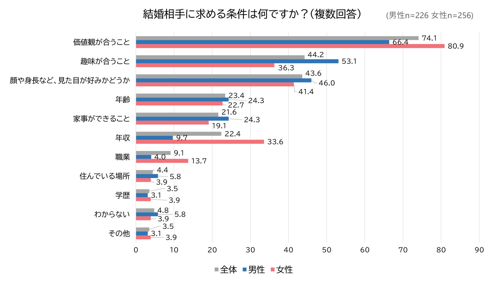 ・「価値観が合うこと」「趣味が合うこと」「顔や身長など、見た目が好みかどうか」が昨年に続き上位3項目を占めた。