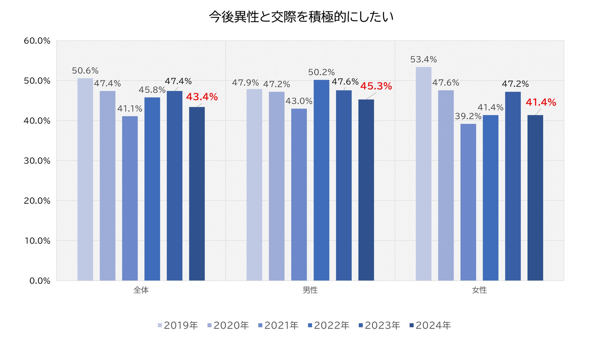 男女618名に「今後異性との交際を積極的にしていきたいですか?」と質問したところ、全体で43.4%の男女が、「積極的にしていきたい」と回答しました。男女ともに前年から減少するという結果になり、2019年以降ではコロナ禍の影響を受けて落ち込んだ2021年に次ぐ低水準(女性は2022年と同値)となりました。